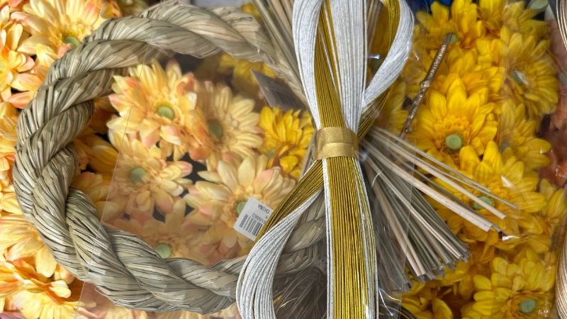 3.水引きを組み合わせてモダンに仕上げます。2種類で迷い、黒も魅力的ですが一般的にはゴールドの方が人気があると判断しました。